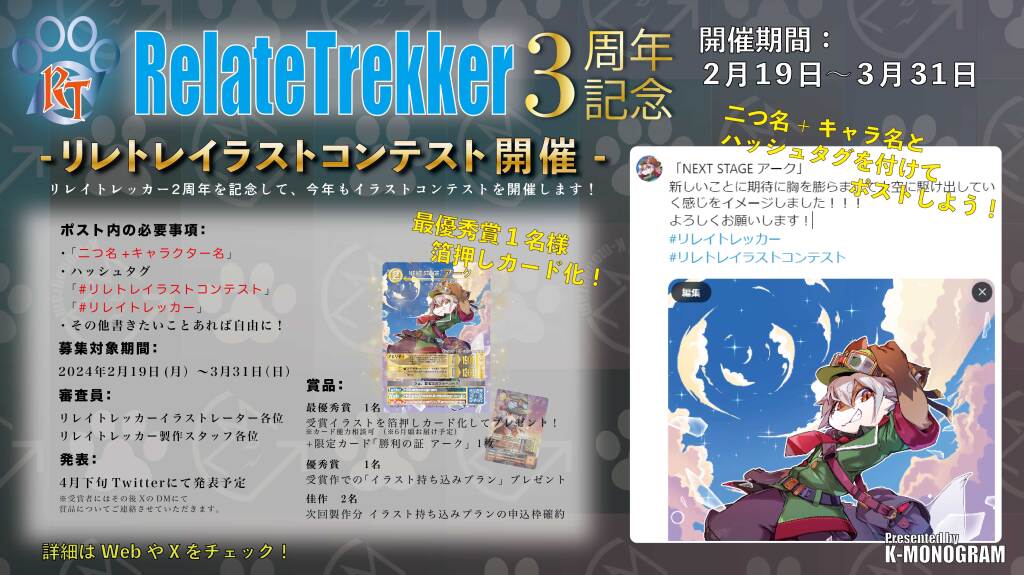 ・ハッシュタグ「#リレトレイラストコンテスト」「#リレイトレッカー」をXのポスト内に記載してください